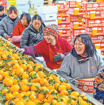 四川省眉山市彭山區(qū)黃豐鎮(zhèn)一家果業(yè)公司車間內(nèi),村民正在分揀耙耙柑。本報記者??宋豪新攝