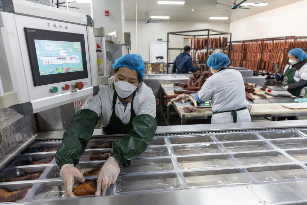?1月20日,在重慶市城口縣坪壩鎮(zhèn)新華村重慶美綴美食品有限公司,工人在外包裝車間利用自動(dòng)打包機(jī)封裝臘肉。城口老臘肉是地處大巴山腹地的重慶市城口縣國家地理標(biāo)志產(chǎn)品。新華社記者黃偉 攝