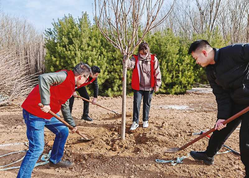 當(dāng)天上午,陽(yáng)光和煦、清風(fēng)徐來(lái),大家三五成群,揮鍬鏟土、扶苗填坑、提桶澆水,共栽植櫻花、金葉女貞、獨(dú)桿月季等樹(shù)苗1500多株。放眼望去,一棵棵新植的樹(shù)苗傲立在春風(fēng)之中,勾勒出一幅充滿希望的綠意畫(huà)卷。